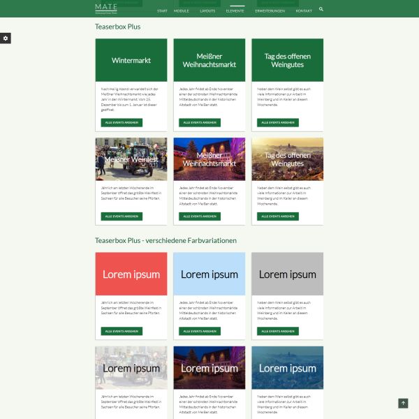 - Content- und Teaser-Boxen: Stelle Inhalte mit verschiedenen Hintergründen, Rahmen und Layoutvarianten in den Fokus.